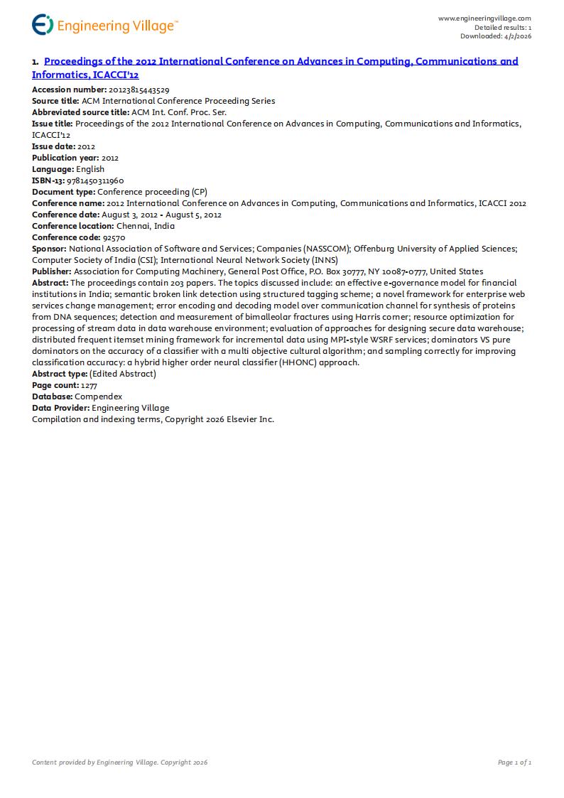 The 2th International Conference on Advances in Computing, Communications and Informatics(ICACCI 2012) has been held successfully in Chennai, India, during August 3-5, 2012.